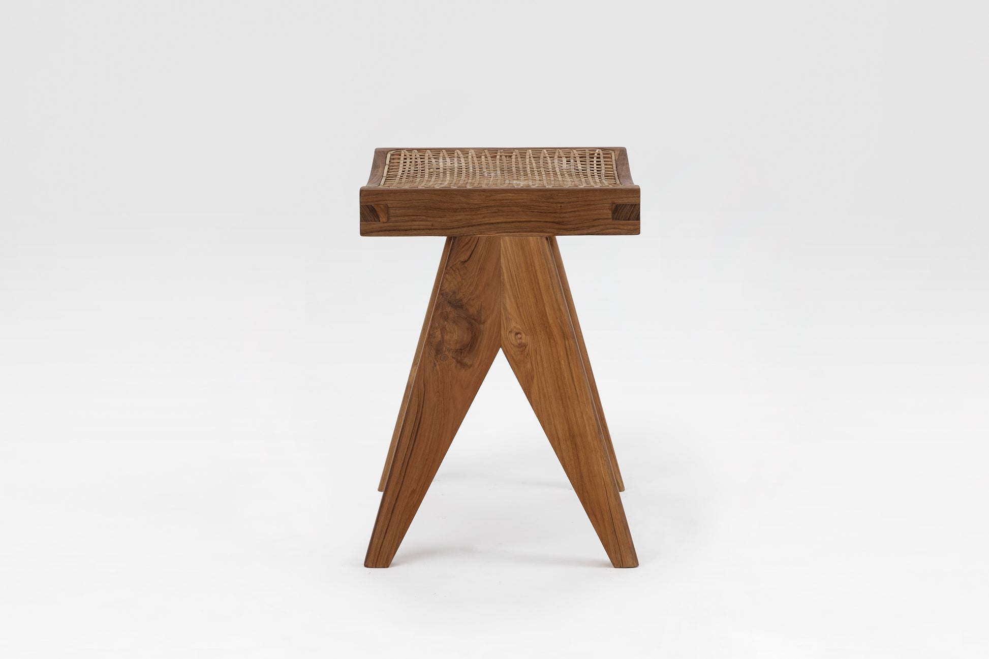 Der Rohrhocker, ein Hockermodell, das für verschiedene öffentliche Gebäude in der Stadt Chandigarh entworfen wurde. Verwendete Materialien: Teakholz (Herkunft: natürliche Wälder in Nordindien) und natürliches Rohrgeflecht.