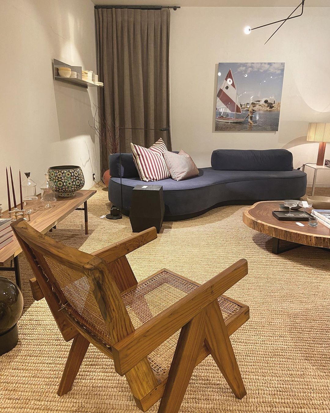 Der klassische Büro-/Esszimmerstuhl wurde nach den Entwürfen von Pierre Jeanneret für verschiedene Verwaltungsbüros in Chandigarh gefertigt. Verwendete Materialien: Teakholz (Herkunft: natürliche Wälder in Nordindien) und Naturrohr. Höhe: 84,5 cm