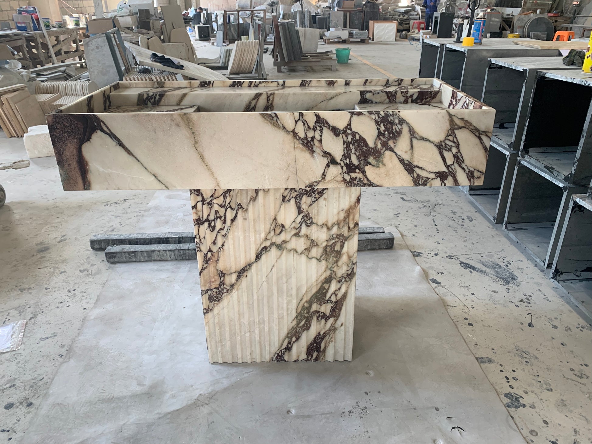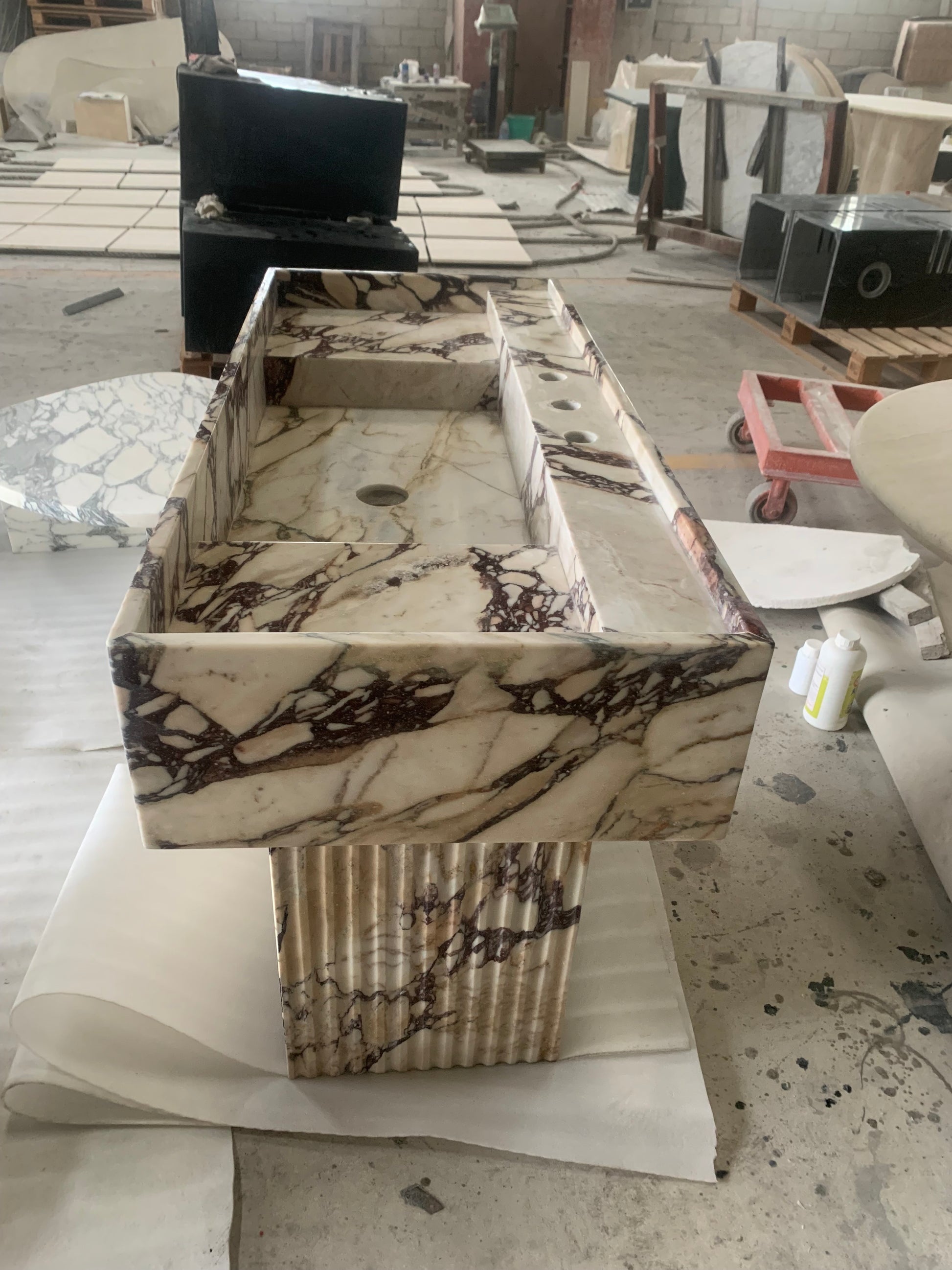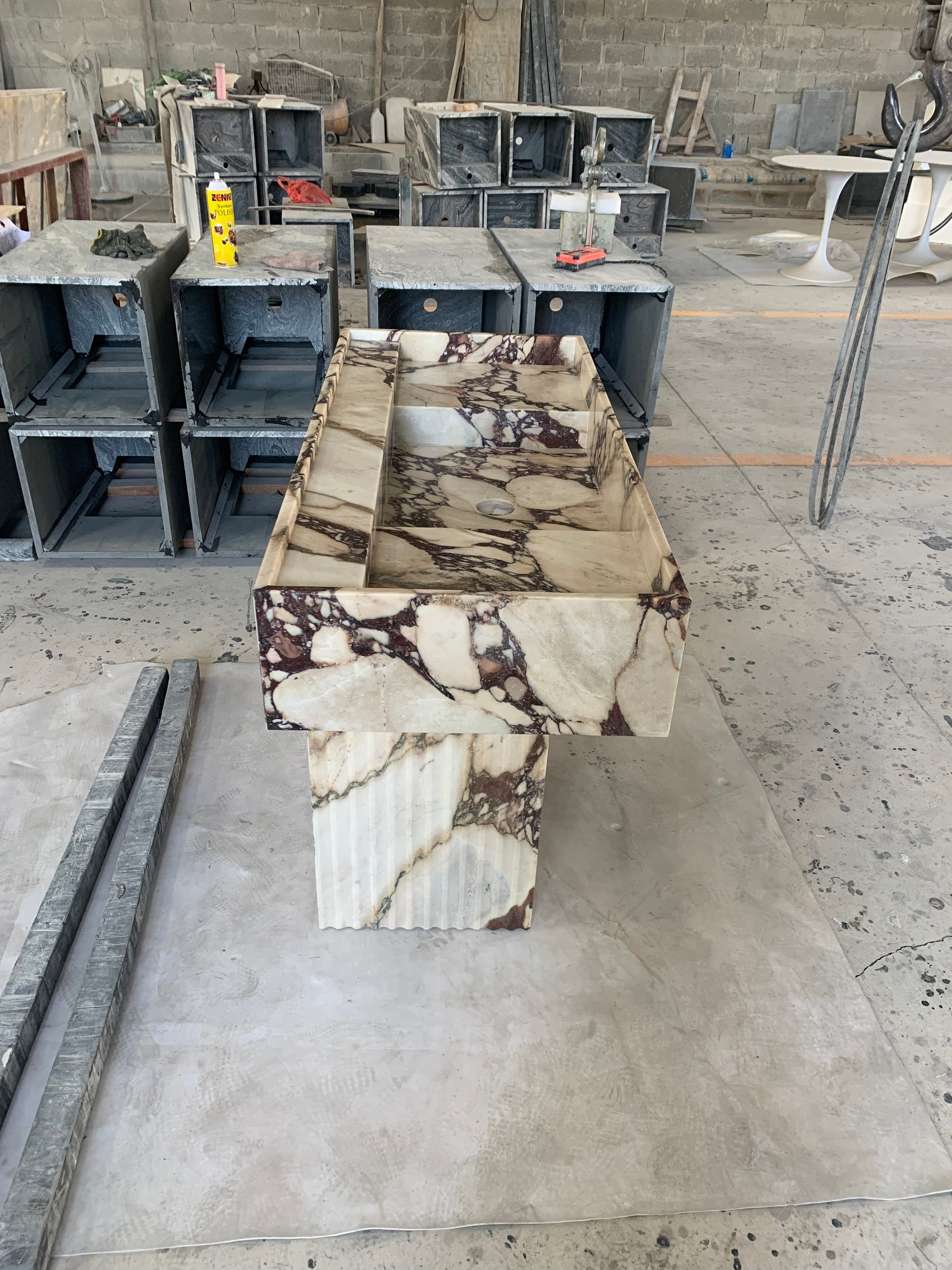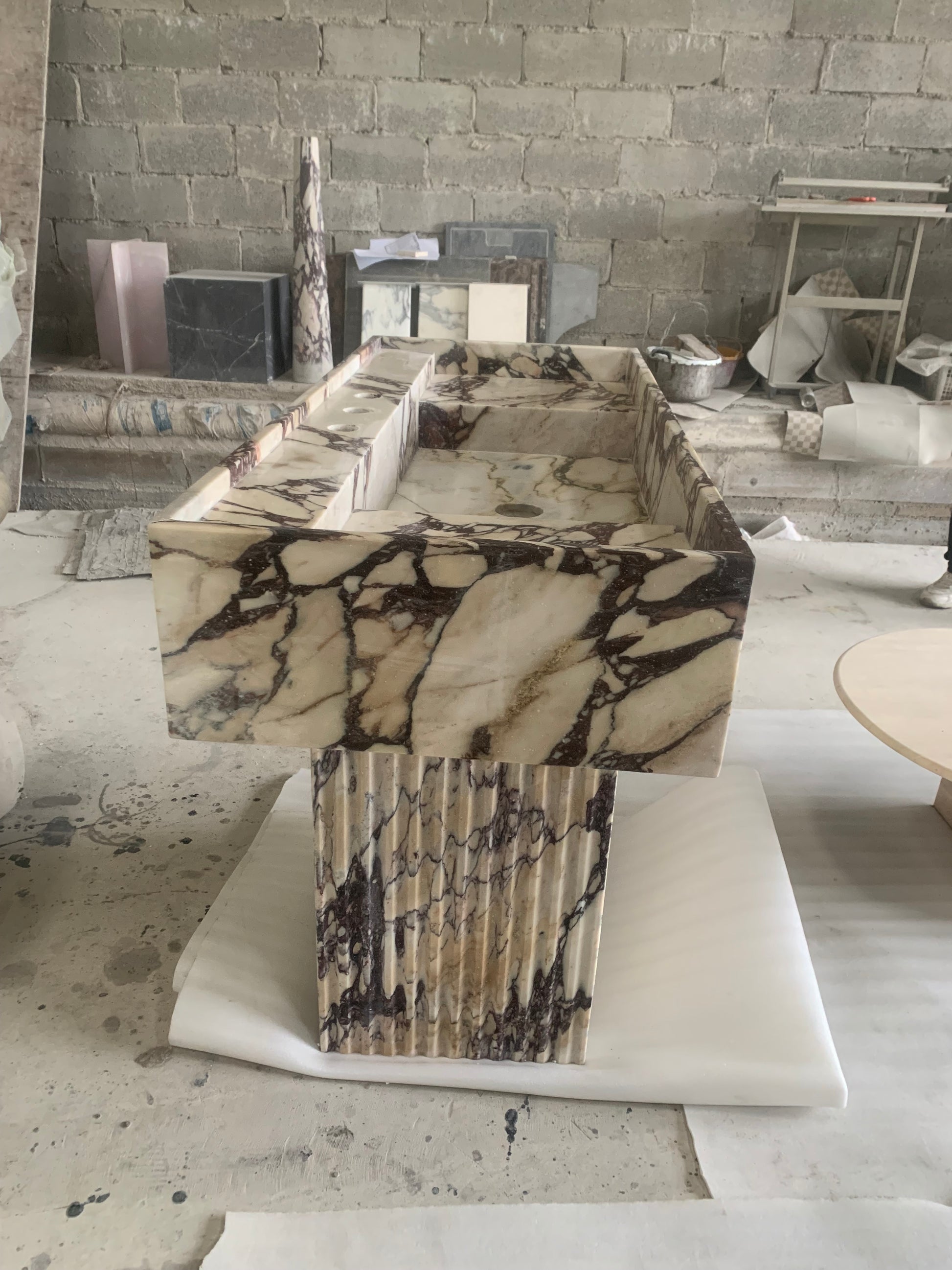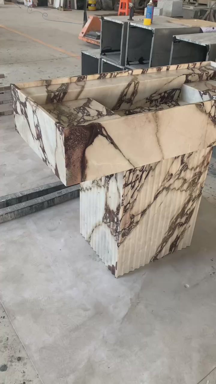 Der Yasmin Waschtisch besticht durch klare Linien und schlichte Eleganz. Inspiriert von der menschlichen Form, wurde dieses Stück nach den Originalskizzen des Designers adaptiert und mit Blick auf harmonische Proportionen gefertigt. Die vertiefte Tischplatte mit ihrer erhöhten Kante verleiht diesem monolithischen Steinstück ein subtiles Detail. Sein minimalistischer Stil macht ihn zu einer vielseitigen Ergänzung für jedes moderne Badezimmer oder Ankleidezimmer.