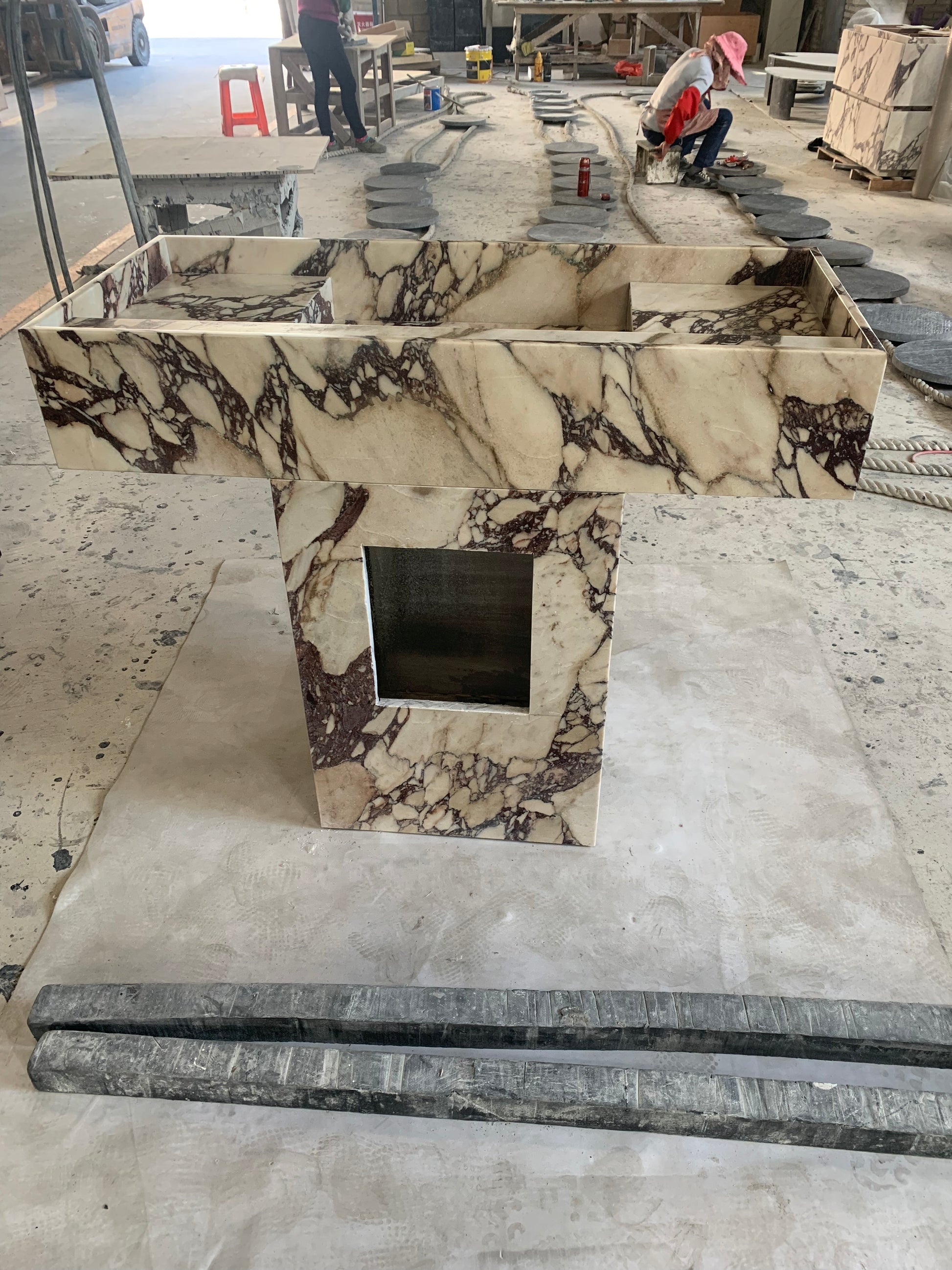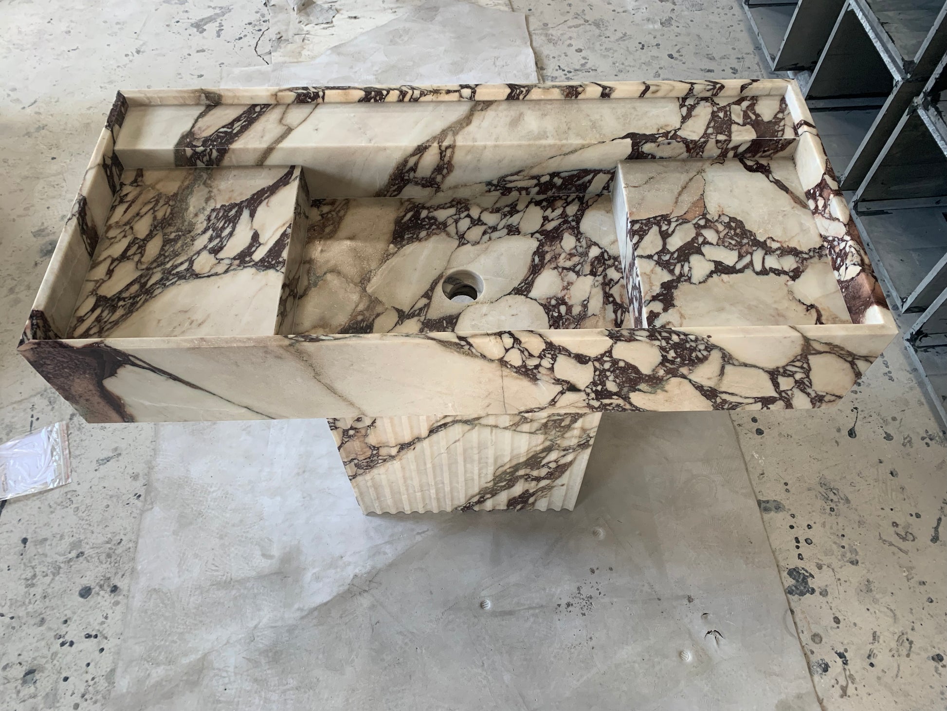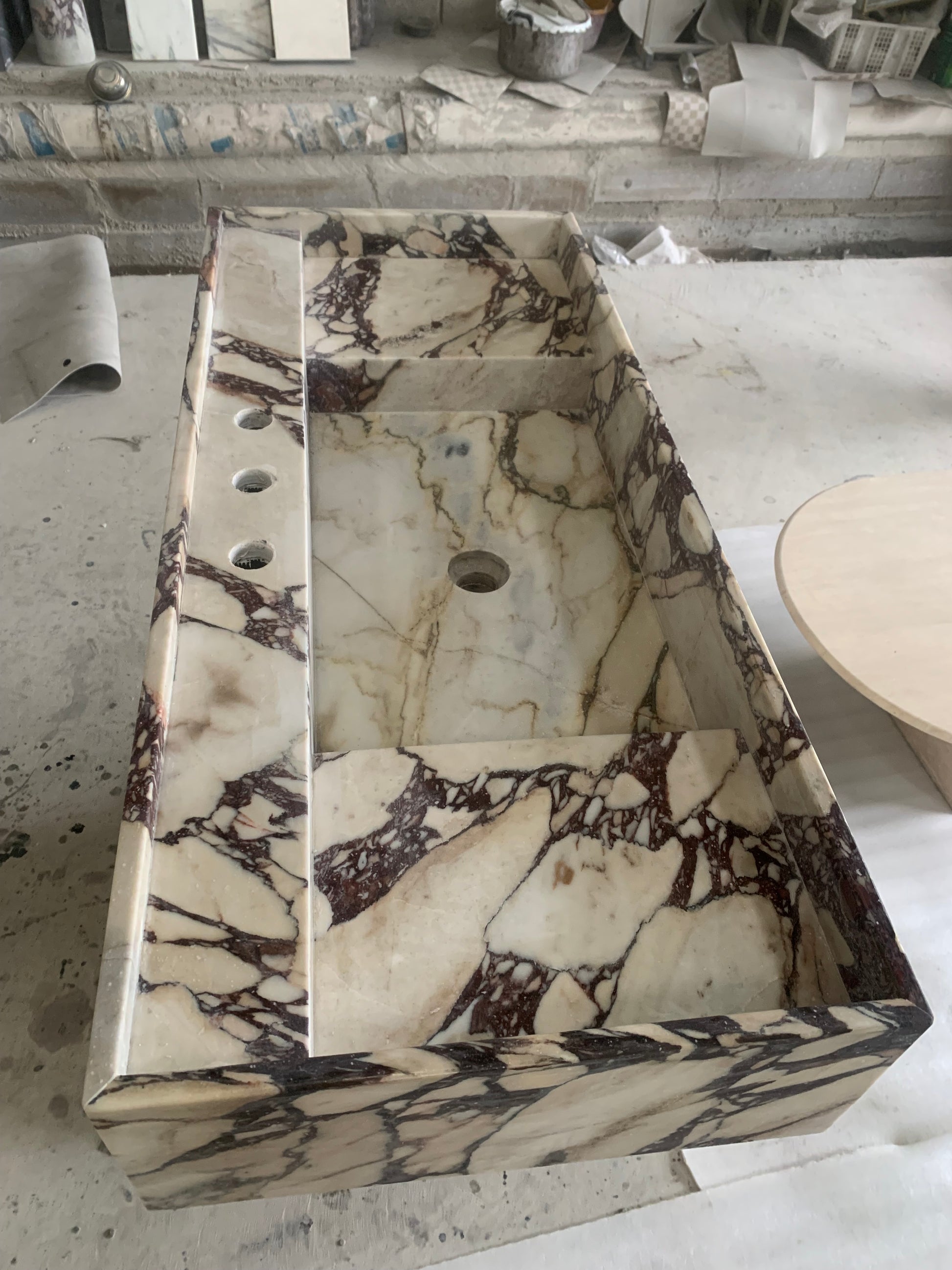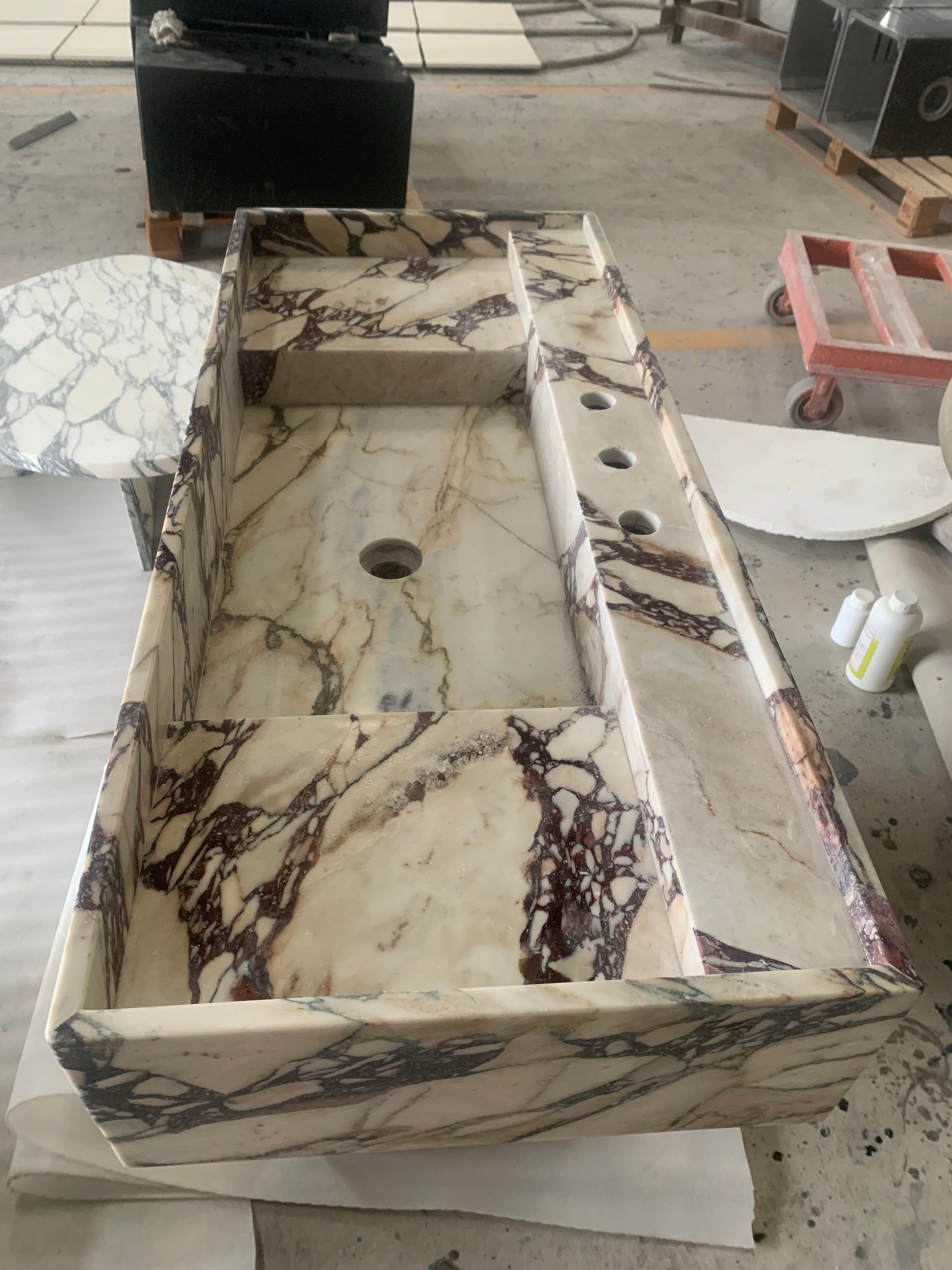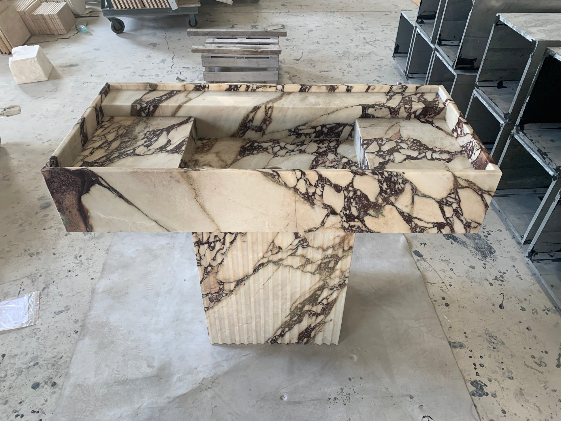 Der Yasmin Waschtisch besticht durch klare Linien und schlichte Eleganz. Inspiriert von der menschlichen Form, wurde dieses Stück nach den Originalskizzen des Designers adaptiert und mit Blick auf harmonische Proportionen gefertigt. Die vertiefte Tischplatte mit ihrer erhöhten Kante verleiht diesem monolithischen Steinstück ein subtiles Detail. Sein minimalistischer Stil macht ihn zu einer vielseitigen Ergänzung für jedes moderne Badezimmer oder Ankleidezimmer.